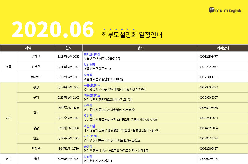 | 초등영어 대표 프랜차이즈 뮤엠영어의 20년 6월 사업설명회 일정표 (2) | 2020.05.25 |
