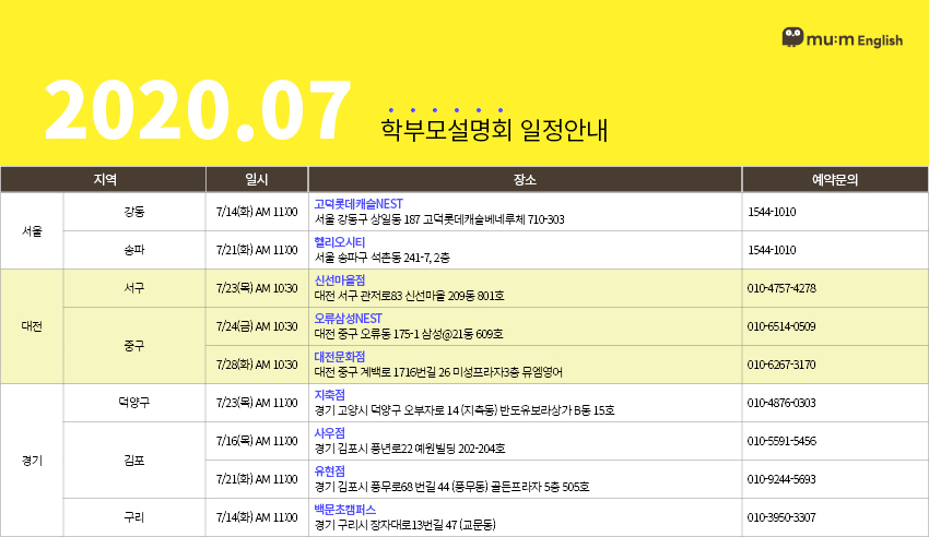 | 초등영어 대표 프랜차이즈 뮤엠영어의 20년 8월 학부모설명회 일정표 (4) | 2020.07.24 |