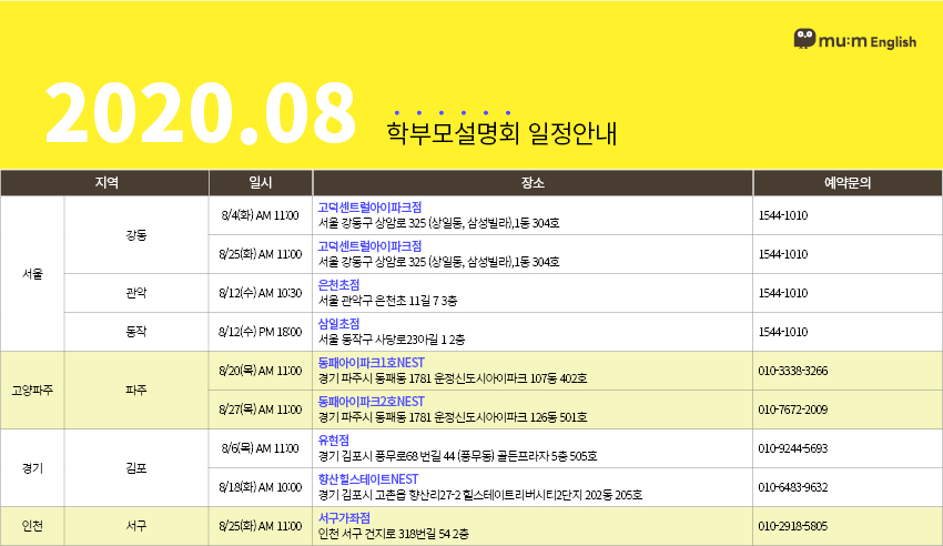 | 초등영어 대표 프랜차이즈 뮤엠영어의 20년 8월 사업설명회 일정표 (4) | 2020.07.24 |
