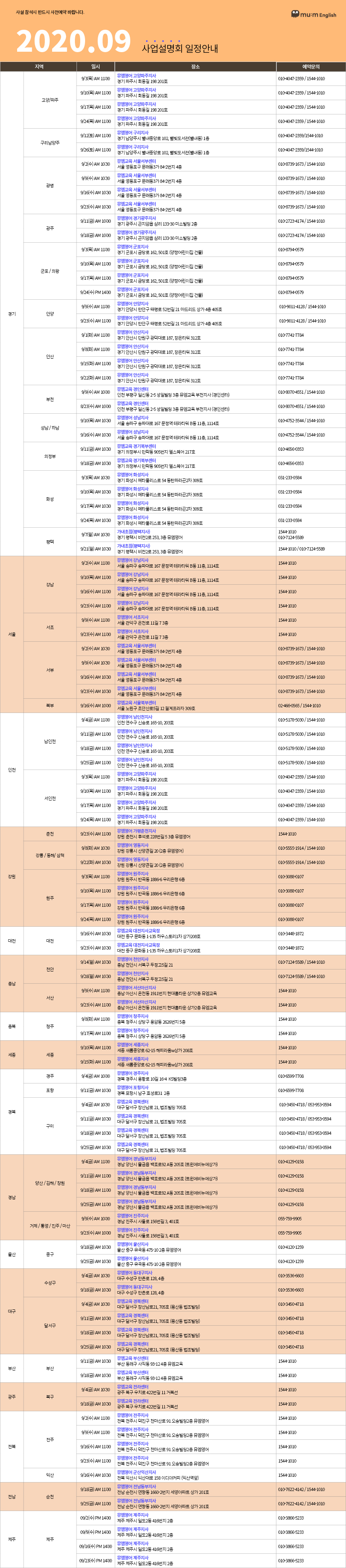 | 초등영어 대표 프랜차이즈 뮤엠영어의 20년 9월 학부모설명회 일정표 (2) | 2020.08.31 |