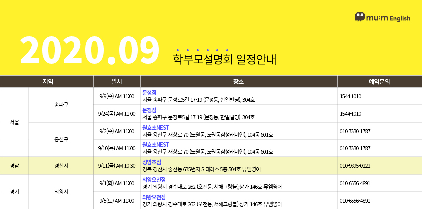 | 초등영어 대표 프랜차이즈 뮤엠영어의 20년 9월 사업설명회 일정표 (4) | 2020.08.31 |